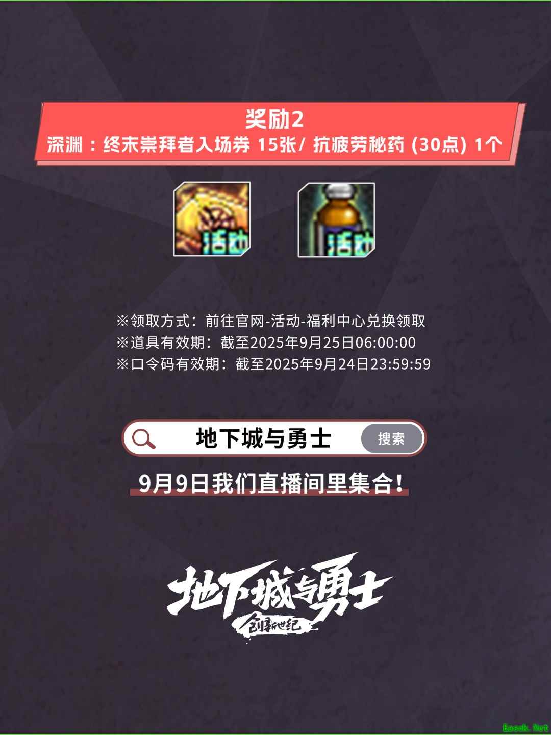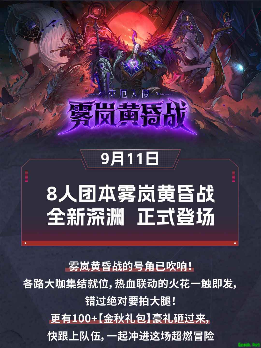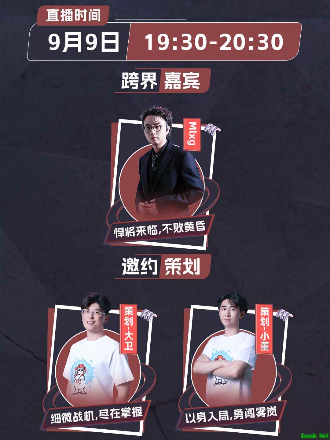 9月11日《地下城与勇士:创新世纪》首个8人同屏攻坚战——雾岚黄昏战! 策划来挑战将在9月9日19:30于各视频平台抢先直播开打!现场还有神秘表演及奖励送上,更有100+套金秋礼包将在DNF助手@Robin 动态抽送,敬请期待。 本次直播特邀6位知名主播与策划同台抢先挑战! 策划团队大卫、小董;跨界嘉宾Mlxg强势降临;DNF知名主播大硕、jj、希曼、黎明、狂人,猛秀操作探索8人团本新解法! 本次新团本中,独特的「闯入机制」点燃全场战斗激情!究竟是谁力挽狂澜最多次数拯救团队?又是谁为大家夺得最多礼包获得神兵天降殊荣?锁定直播间,我们一起揭晓【雾岚黄昏战】的神秘面纱! |