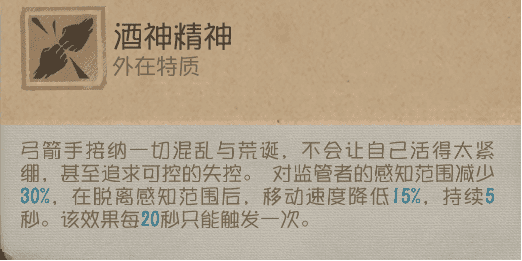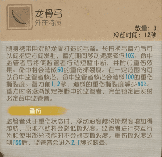 本次由【官方攻略组——里米特3】为大家带来弓箭手的基础攻略~ 技能分析 【外在特质:龙骨弓】 ![]() 技能解析: ①弓箭手随身携带三支弓箭,长按蓄力后可以发射,蓄力时会减少10%的移速,命中监管者会短暂中断监管者当前行动使监管者陷入重伤状态,并附加50的撕裂度; ②在一定范围内可以命中监管者核心,命中核心将造成100的撕裂度; ![]() ![]() ③蓄力前1.2秒造成重伤撕裂度减少40%。蓄力时将逐渐锁定监管者,完全锁定后必中监管者。 【重伤】 ①在处于重伤状态下,监管者使用位移技能或者加速技能都会快速增加撕裂度,监管者在进行交互和使用不会位移的技能时不会增加撕裂度; ![]() ![]() ②撕裂度达到100时将会眩晕监管者2.1秒,监管者原地不动可以减少撕裂度直至消失; ③监管者附近18米内如果有其他求生者,监管者原地不动时撕裂度下降速度加快15%,撕裂度达到100点时眩晕时间减少15%。 ![]() 实战注意: ①龙骨弓蓄力时将会减少移动速度,请与监管者保持一定距离的情况下再进行蓄力; ②龙骨弓蓄力前1.2秒造成撕裂度较少,尽量蓄力1.2秒再后发射; ③重伤状态下监管者正常移动时撕裂度增长较为缓慢,在使用龙骨弓命中监管者后先正常进行牵制,等撕裂度较高时再考虑转点; ④当重伤状态下监管者站立不动时,很有可能是在清除撕裂度,此时可以选择转点。 【外在特质:臂弩】 ![]() 技能解析:点击发射后会后跃一些距离,可以短暂中断监管者行动,并对监管者造成50的重伤撕裂度。 实战注意:在后跃时要留意后方障碍物,确保不会撞墙。 【外在特质:酒神精神】 ![]() 技能解析:弓箭手的感知范围(心跳示警范围)减少30%,在脱离感知范围后移速减少15%该效果每20秒只会触发一次。 实战注意: ①由于弓箭手对监管者的感知范围较小,在破译密码机时要时刻注意四周提防监管者; ②在触发减速后如果再次使用龙骨弓蓄力,将会触发双重减速,尽量避免此操作。 天赋推荐 天赋推荐一:飞轮效应+回光返照+结伴效应+防御机制+感觉适应+观众效应 ![]() 在对局中,弓箭手拥有十分出色的牵制与干扰能力,携带“飞轮效应”在面对监管者时会更加游刃有余,“飞轮效应”可在关键时刻躲避监管者的攻击,加上“臂弩”的后跃可以让弓箭手干扰或者牵制时更加灵活,“肌肉记忆”和“防御机制”增加的交互速度会增加在板窗区域博弈成功的概率。携带“感觉适应”在高墙区能避免被反绕,“观众效应”则能让自身更快地破译第一台密码机,继而可以协助队友牵制。“结伴效应”提供的移速加成能让弓箭手更好地进行二次牵制。 天赋推荐二:膝跳反射+回光返照+韦伯定律+结伴效应+绝处逢生 ![]() 由于弓箭手蓄力时自身会减速,容易被监管者更快接近。“膝跳反射”弥补了这一点,不论是射监管者后利用翻越木板/窗户获得的加速效果拉开距离,还是先翻越木板/窗户获得加速效果再蓄力射箭都会让自身射箭容错率更高。“韦伯定律”在开局被监管者贴近时会有一个移速加成,用来拉开距离或进行转点。“结伴效应”使自身被救下以后也有一段移速加成,以便于二次牵制。 克制关系 克制监管者:歌剧演员、红蝶、“愚人金” ①在面对歌剧演员时,只需要保证龙骨弓的命中率即可,歌剧演员在影跃时会快速增加撕裂度,所以只需要命中歌剧演员,就能快速使其眩晕或者让其在原地等待撕裂度下降。 ②红蝶会朝向燕尾蝶飞行,可以在红蝶飞行时蓄力瞄准着燕尾蝶,等待红蝶落地就可以射中。如果被燕尾蝶附身,可以直接蓄力盯着红蝶,此时红蝶无法使用刹那生灭并且会被龙骨弓慢慢锁定。 ③“愚人金”依赖于自身的快速位移以及板区架点能力,“愚人金”利用牵引位移后有一个收镐的动作,只需要在其位移后发射弓箭即可,并且弓箭手可以通过龙骨弓以及弩箭的组合立刻打满100的撕裂度,做到不依靠板区进行牵制。 被监管者克制:红夫人、时空之影、隐士 ①红夫人可以投射镜像进行远程攻击,并且攻击距离大于龙骨弓射程。在面对红夫人时最好先躲在拐角处等待红夫人寻找,等快贴近的时候优先使用臂弩再举起龙骨弓进行蓄力,如果此时红夫人释放水镜,就直接发射弓箭可以打满100的撕裂度。在距离较远时可以把臂弩当做一个位移技能使用,在关键时刻使用臂弩躲掉一刀可以大大增加无伤耗掉红夫人镜像的概率。 ②在面对时空之影时常规的蓄力就不太好用,时空之影的异族本相会打断的龙骨弓蓄力,此时最好优先骗出时空之影本体“艾维”的异族本相技能后再进行蓄力攻击。或者利用快速射箭加臂弩立即造成100的撕裂度,使其眩晕。 ③隐士的攻击距离和弓箭手差不多,但是隐士的技能拥有控制效果,所以弓箭手在蓄力时很可能被隐士控制。面对隐士时需要拉开距离尽量不要进行蓄力,在近距离时隐士更加强势,可以在拐角射箭命中或者蓄力命中其核心对其造成眩晕。 对局思路 弓箭手作为一名拥有出色的牵制与辅助干扰能力,开局可以选择相对危险的位置。在队友被监管者追击到附近时可以及时使用龙骨弓进行辅助,再搭配上臂弩轻松就能打满100撕裂度。弓箭手在牵制时可以不追求蓄力命中监管者核心,正常蓄力命中再进行交互点博弈牵制也是能达到100撕裂度,并且还有臂弩可以补充容错率。在辅助队友牵制时可以优先使用臂弩对监管者造成50的撕裂度,这样即使不命中监管者核心也