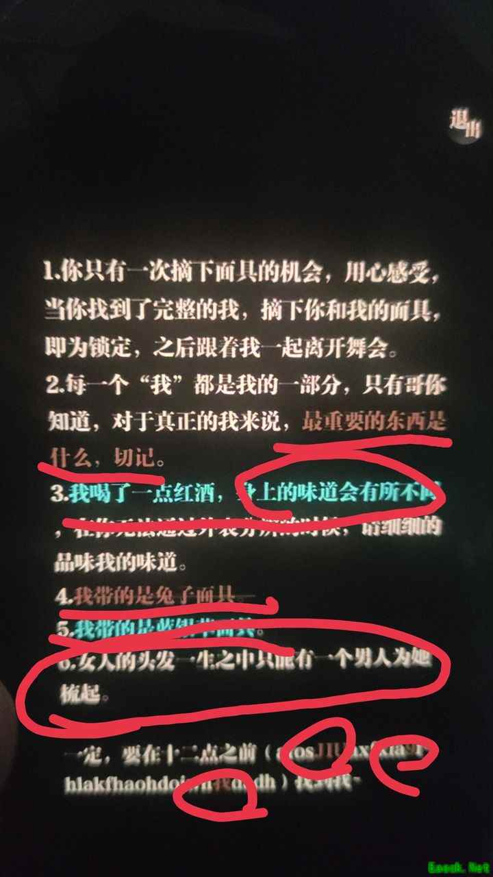 斗罗大陆:武魂觉醒镜花水月第一——三章解谜攻略来啦!从七号钥匙、左转提示,到紫檀木梳与蓝银草面具的细节,层层揭开谜题关键!不容错过的通关要点,助你顺利找到真正的小舞!游戏攻略 斗罗大陆武魂觉醒 最后的数字7提示这把钥匙可能是七号。 标注了左转,也可能真的是左转。 这里又提到,如果是红色铃铛就抱,不是红色铃铛就不抱,而我们遇到的是紫色铃铛,所以可以不抱。 在此声明,不可回头,务必谨记! 第二章 1.必须带面具 最重要的物品应该是梳子,因为在前一章中,梳子特意用黑色字体标注,而这里再次强调其重要性,并以褐色呈现,恰好与紫檀木梳的颜色相符。 小舞提到自己喝了些红酒,并用蓝色字体标注,还表示红酒味道有些不同,怀疑是否带有青草味。 这里提到是兔子面具,但她划掉后又说是蓝银草面具,而且用的是蓝色字体,很可能真是蓝银草面具。 女人一生只能由她的男人梳头,但小舞为何要拿梳子?所以不给。 一定要在12点前找到小舞,标记了jiu 9我这个,说明后面的选项不管是亲还是不亲,都可能不是小舞,所以选择不亲。 第三章 眼前的小舞并非真正的她本人。 既然不是小舞,定亲的事也可以不去,过去看看究竟是什么情况。 前面说过,红色铃铛必须带走,我们也可救下这只红铃兔,此刻她正面对人面魔蛛,我们必须救她。 第二张图中明确提示了左和右,最后一段提到有其实是右的谐音,因此最后的岔路口应选择右,即整体路线为左、右、右。 区服:37azml_1784 服务器名称:众神四服 角色id:1532_37azml_1784 UID:2178798845 山海灯火,照亮前行路。 |