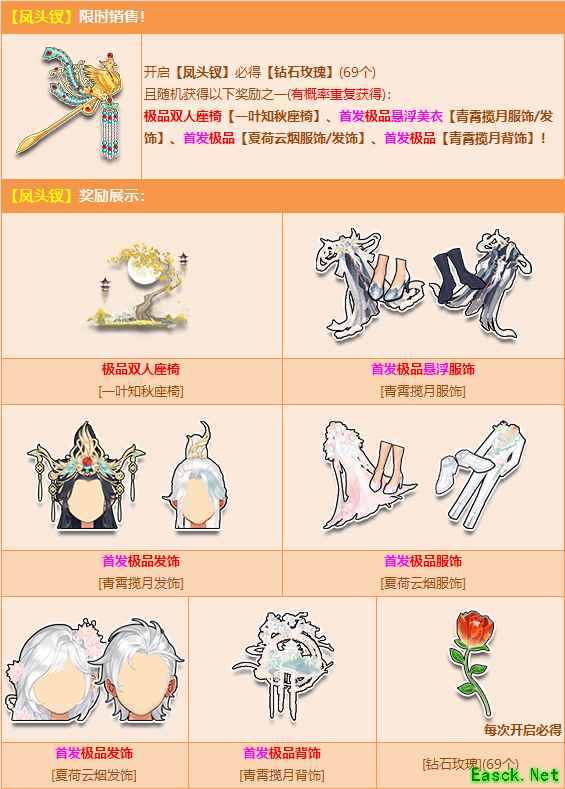 9月13日-10月12日,开启【凤头钗】必得极品道具【钻石玫瑰】*69,且随机获得以下奖励之一(有概率重复获得):极品双人座椅【一叶知秋座椅】、首发极品悬浮美衣【青霄揽月服饰/发饰】、首发极品【夏荷云烟服饰/发饰】、首发极品【青霄揽月背饰】! 注:9月13日-9月21日,【凤头钗】限时5折,限购3个! |