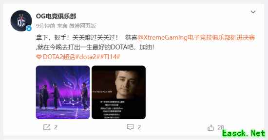 今日,Ti14中国战队XG挺进总决赛,这也是中国战队时隔四年后再一次进入Ti总决赛。 比赛结束后,多位知名博主在社媒发帖,庆贺XG成绩! 博主们发文庆贺: