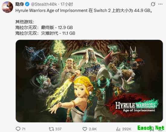9月15日,推特知名用户Stealth40k发文分别爆料了《超级马里奥银河》、《塞尔达无双:囚禁时代》、《最终幻想 VII 重制版 Intergrade》的NS2版容量大小。 《超级马里奥银河》3.3GB 《超级马里奥银河2》2.6GB 《塞尔达无双:囚禁时代》44.9GB 《最终幻想 VII 重制版 Intergrade》87.9GB 三款游戏的大小相比Switch上的其他游戏来说有些偏大,然而考虑到Switch2上的部分游戏,不由得让人感叹NS的游戏容量大小也开始膨胀起来。 对此你怎么看? 本文由制作发布,未经允许禁止转载。 |