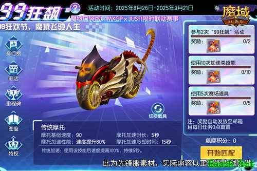 游戏内福利大放送为了回馈玩家,购买联动头盔的玩家将获赠超值大礼包,其中包含的缰绳・疾影风驰与破界轰鸣特效称号,让无数玩家心动。缰绳・疾影风驰具有永久时效。它的外观设计独特,流线型的线条搭配上闪耀的装饰,仿佛一匹来自神秘世界的天马,充满了奇幻色彩。 而破界轰鸣特效称号则拥有360天的时效,在这一年的时间里,玩家可以尽情展示自己的独特身份。这个称号不仅是一种荣誉的象征,更能带来强大的视觉效果。 联动活动玩法全解析除了令人心动的联动头盔与福利,活动期间,游戏内还上线了联动赛事玩法“99狂飙”,将速度与激情完美融入到游戏之中,给玩家带来全新的游戏体验。玩家可以化身为赛车手,驾驭着定制的摩托车,在紧张刺激的6人同场竞技赛道中展开限时竞速。 赛道的设计堪称一绝,充分还原了MXGP赛事的特色,各种直道加速、弯道漂移等操作机制一应俱全。当玩家在直道上时,可以尽情享受速度带来的快感,感受风驰电掣般的激情;而在弯道处,则需要运用巧妙的漂移技巧,精准地控制车身,稍有不慎就可能会失控,与胜利失之交臂。这种高度还原真实赛车体验的设计,让玩家仿佛置身于现实的MXGP赛场之中,每一次加速、每一次漂移,都充满了紧张与刺激。 此外,赛道上还引入了能量积攒、道具干扰等策略元素。玩家在比赛过程中,可以通过合理的操作来积攒能量,当能量满格时,就能释放强大的技能,瞬间提升速度,超越对手。道具干扰则为比赛增添了更多的不确定性和趣味性。
