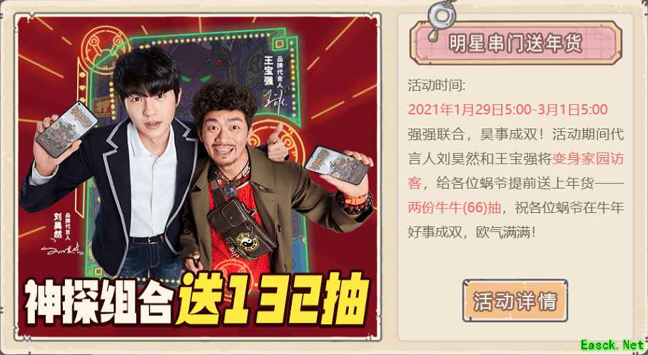 有代言人没有福利怎么行?王宝强、刘昊然化身游戏NPC,带着年货正式抵达玩家的家园。玩家们不但可以和两位实力派演员一对一对话,还能够获得两份牛牛(66)抽!