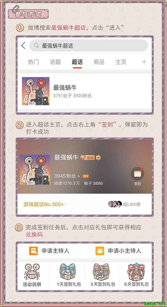 随着贺岁版本的开启,最强蜗牛微博超话签到福利也正式启动,限时签到即领兑换码,关注官方微博@最强蜗牛手游,参与视频转发活动,还能赢取现金、签名照等好礼。