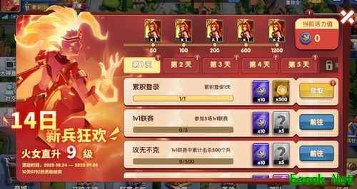 首次创建账号后,每日登录完成对应任务,即可获得金币+兵种碎片+联赛卡包钥匙的奖励,更可额外火女英雄碎片。连续完成14日任务,可获得总计金币*28500+各等级兵种碎片240个+13把钥匙的奖励,英雄火女更可直升9级。 2、公测5天内登陆送火女皮肤(史诗级)
