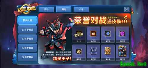 9月1日-9月5日,公测五天内上线就送15000金币,50张普通兵种卡,30张稀有兵种卡,外加5把宝箱钥匙,更有火女史诗皮肤——奥术女神等你领取! 3、荣誉对战赢精灵王子皮肤