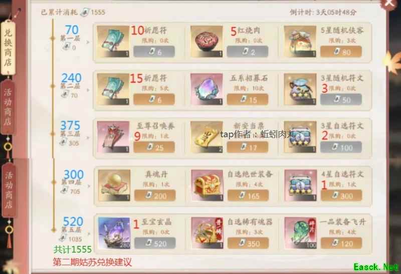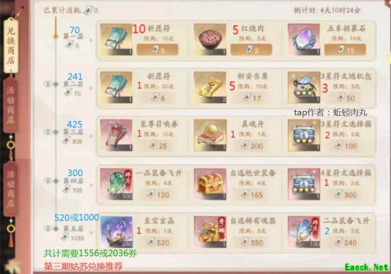 提到姑苏活动,相信很多玩家都非常熟悉,每半个月就会轮换一次,通常还会与幸运招募一同出现。不过,仍有不少朋友经常询问:有没有最新的姑苏兑换信息图?这次就专门为大家详细讲解一次姑苏兑换活动,带你全面了解整个姑苏活动的内容。 一、规则 活动期间,玩家可通过完成任务或在活动商店购买来获取姑苏道具。 每日任务会刷新,请注意及时完成。 姑苏券可用于活动兑换商店,换取大侠心仪的物品。 姑苏券在活动结束后仍可保留,大侯可在下次活动时继续使用。 重点提示:姑苏券在活动结束后仍可使用,建议囤积留存,后续可兑换更高级的奖励。 活动商店内容如下: 活动商店分为金龙和玉龙两个购买项目,具体所示。 活动商店购买建议如下: 氪金玩家、月卡玩家建议购买姑苏券助力包,或选择不购买。 购买原因是因有60张券,参加活动时会比别人多60次机会,能更快完成任务。 如果不购买,主要是因为平时攒金龙压力较大,建议多留一些金龙用于新安党活动,每次可多存5664金龙,一个月下来能多出约1万金龙,长期来看还是挺划算的。 建议微氪和中氪玩家购买姑苏券特惠包(30玉龙)和姑苏超值包(98玉龙)。 参加活动后可多获得130张券,获取数量比不氪金的玩家多出两倍,大大加快进度,而且越早兑换至宝、拿到血玉,对早期学习仙术帮助很大。 建议购买姑苏券尊享包(198玉龙),但不推荐购买姑苏券豪华包(648玉龙)。 购买理由:只要集齐11个198元的礼包,基本就能获得至宝,而姑苏的主要目标并非魂器,获取至宝才是首要任务。至于648元的礼包,性价比并不高,全部购买相当于中秋期间一次重楼活动的花费。回顾中秋活动,仅需7700玉龙便可获得三款重楼皮肤、阴阳侠客自选箱以及自选阴阳魂器,相比之下,姑苏礼包的吸引力显然不足,因此并不推荐购买。 三、姑苏任务 姑苏任务包含日常与限时两类,日常任务每日0点至24点为一轮,限时任务则在每个活动周期内进行,具体要求和奖励如下: 姑苏商品兑换服务介绍 姑苏商品兑换推荐一览 蚯蚓依据游戏当前进度对姑苏商品进行评级,每层分为SS级和S级两类,建议优先兑换,尤其是SS级为必换类型;A级为凑进度首选商品,B级为次选,C级则不建议购买。 (二)推荐姑苏商品的理由如下: 第一层级: 红烧肉是优先推荐的道具,在游戏等级达到96级前,每次到达姑苏时建议购买红烧肉,因为体力对升级至关重要。96级后每天固定赌27点仙术,此时无需每次都购买红烧肉,合理节省姑苏券的使用。 绿票较推荐,属于运气型,适合凑进度,第一层级优先选择绿票。 五星侠客随机包和五系石头不值得购买,建议避免。 第二层级: 三星随机符文性价比高,现符文紧缺,50券购入,物超所值。 新安当票建议满8轮再当,减轻金龙负担。 绿票早期推荐,但第三期出现新安当票后,优先级下降,现较不推荐。 五系石头不推荐购买,请勿选购。 第三层级: 真魂丹非常推荐,第三期降至第三层,最适合凑进度,只需服用10次即可满额,性价比极高。 三星自选符文性价比高,100券兑换一个,现在符文紧缺,非常推荐入手。 红票推荐度较低,通常在第三期出现,除非下次至尊招募缺票,否则一般不建议用蚯蚓换红票。 六星助力箱性价比低,不建议购买。 第四层级: 四星自选符文非常值得推荐,300券购买一个四星自选符文,性价比远高于第三层级的三星自选符文。 红票代表推荐,在活动前两期参与至尊招募时使用红票能加速进度。 自选绝世装备较不推荐,缺进度时再考虑购买,不缺进度无需选择。 真魂丹与一品装备飞升石并不推荐购买。 第五层级: 至宝玄晶非常推荐,姑苏为此而来,推荐原因不言而喻。 二品飞升石非常值得推荐,目前游戏中除了神虚每月赠送一块外,只能通过琉璃矿低概率获取,或者每周购买198元的礼包积累碎片合成,整体获取难度较高,属于稀缺资源,建议尽早入手。 自选魂器和绝世装备不推荐,姑苏不适合整这些,别买。 每期需囤积的姑苏票 姑苏首期兑换信息一览表: 第二期姑苏兑换详情一览 第三期姑苏兑换推荐内容如下: 六、总结: 大家可以参考推荐图准备姑苏券,这是一个不错的活动,但不必急于一次性完成兑换,避免因急躁而花费不必要的冤枉钱。建议根据推荐方案合理规划使用。 |