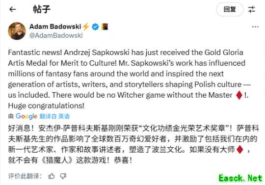 《巫师》原作者获波兰国家大奖!CDPR发文祝贺!