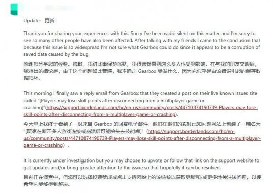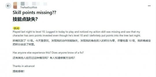 Gearbox旗下最新射击掠夺游戏《无主之地4》近日出现一个严重漏洞,导致部分玩家遭遇重大进度损失。 ![]() 目前有玩家反映在《无主之地4》中遭遇技能点异常消失问题。玩家TheRealSoyKRob在Reddit论坛发布警示帖,称其角色达到10级后下线,再次登录时发现所有已分配的技能点从技能树中神秘消失,所有构筑进度付诸东流。SDU升级也同时被重置,帖文下方多名玩家表示即使升级或重置技能点也无法恢复损失。 ![]() ![]() 根据现有反馈,该漏洞疑似与在线联机功能相关——多位玩家在回帖中指出问题发生在结束多人游戏会话重新登录后。 ![]() 对于已投入大量时间的玩家而言,技能点与技能树进度清零堪称毁灭性打击。作为《无主之地4》当前最紧迫的技术问题,预计官方将在近期发布的更新补丁中优先解决此漏洞。 |