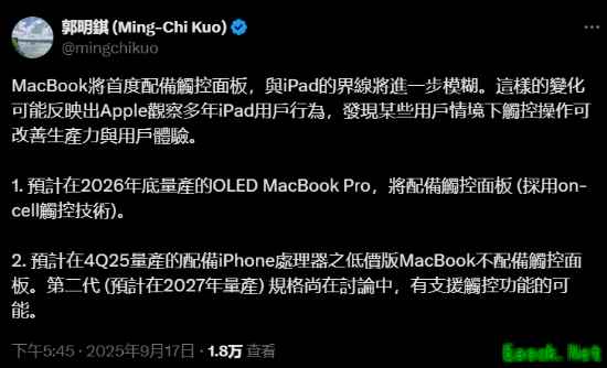 分析师郭明錤今日表示,MacBook将首度配备触控面板,与iPad的界线将进一步模糊。这样的变化可能反映出苹果观察多年iPad用户行为,发现某些用户情境下触控操作可改善生产力与用户体验。 郭明錤称,预计在2026年底量产的OLED MacBook Pro将配备触控面板。预计在今年四季度量产的配备iPhone处理器之低价版MacBook不配备触控面板。第二代规格尚在讨论中,有支持触控功能的可能。 据财联社此前报道,OLED MacBook Pro预计将在2026年下半年发布,采用三星的OLED面板,配备混合结构和串联显示技术。苹果将采用与iPad Pro相同的串联OLED显示技术,这种双堆叠设计能显著提升屏幕亮度和延长寿命。OLED技术的应用可能促使苹果放弃目前的刘海设计,转而采用更小的摄像头孔径设计。 |