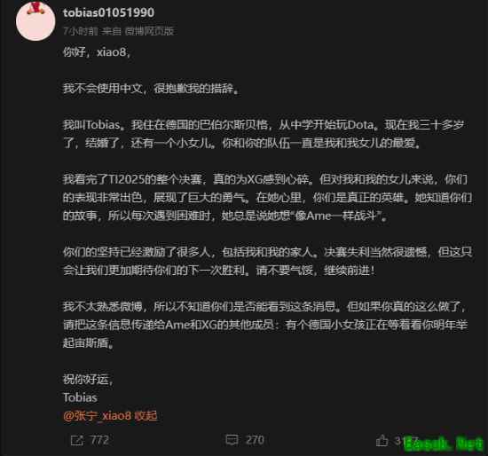 Tobias在文中回忆道,自己从中学时代就开始玩Dota,如今已年过三十,结婚并有了一个可爱的女儿。“你和你的队伍一直是我和我女儿最喜欢的战队。” 他表示,看完整场决赛后,虽然为XG感到心碎,但对他和女儿而言,XG的表现堪称出色,展现了勇气。“在她心里,你们才是真正的英雄。她知道你们的故事,所以每次遇到困难,她都会说,自己要‘像Ame一样战斗’。” Tobias动情写道:“你们的坚持已经激励了许许多多人,包括我和我的家人。决赛失利固然遗憾,但这只会让我们更加期待你们下一次的胜利。请不要气馁,继续前进.我不太熟悉微博,不确定你们能否看到这条消息。但如果看到了,请把我的心意转告给Ame和所有XG队员:在德国有个小女孩,正期待着明年看到你们高举不朽盾。祝你们好运。”