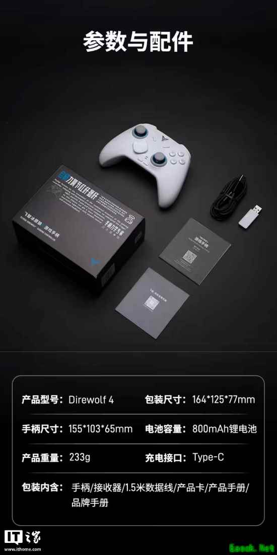 飞智冰原狼 4 游戏手柄支持六轴体感,内置 800mAh 锂电池,可选配无线充电底座,支持使用有线 / 蓝牙 / 2.4GHz 连接,预售价 189 元起。