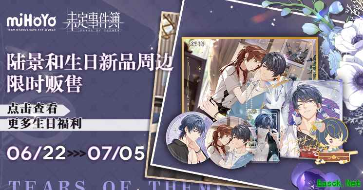 精美生日周边上架 心绪缱绻同织情梦 6月22日起,《未定事件簿》官方天猫商城及米游社未名商城开启陆景和生日活动,多样精美周边上新,多重福利活动限时开启。 为庆贺陆景和生日,商城将上架「岁海织梦」系列周边,精美生日徽章、色纸、厚亚克力挂件、庆生装饰画……多款生日限定周边暗藏缱绻心绪。岁海浮沉,爱意炽盛。铭刻相伴时光,同织浪漫情梦。
