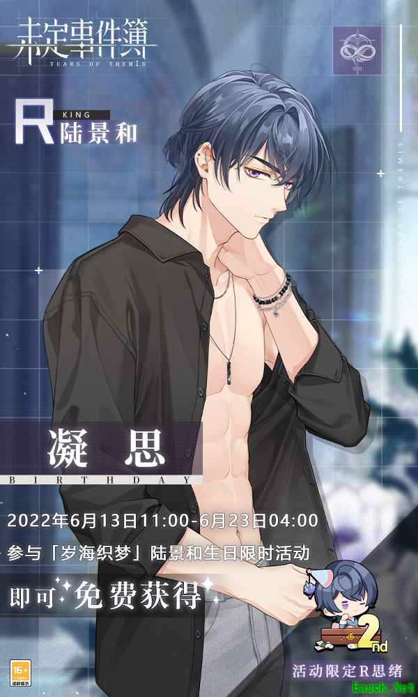 生日限定福利解锁 执笔共绘爱意绵延 与陆景和一同完成愿望清单的「岁海织梦」活动已近尾声,多重限定活动奖励今日解锁。6月21日0:00起,陆景和生日专属剧情终章「庆祝生日」解锁,完成生日限时任务可以获得陆景和生日限定R思绪【凝思】、【女神之泪】,完成活动系列心愿行程,可获得生日限定服装【陆景和·织梦】、生日限定背景【陆景和卧室】及活动纪念徽章【岁海织梦】等多重限定奖励。此外,6月21日0:00至6月27日23:59期间,登录游戏还可获得生日专属短信【双向惊喜】、专属语音电话【岁海织梦】。
