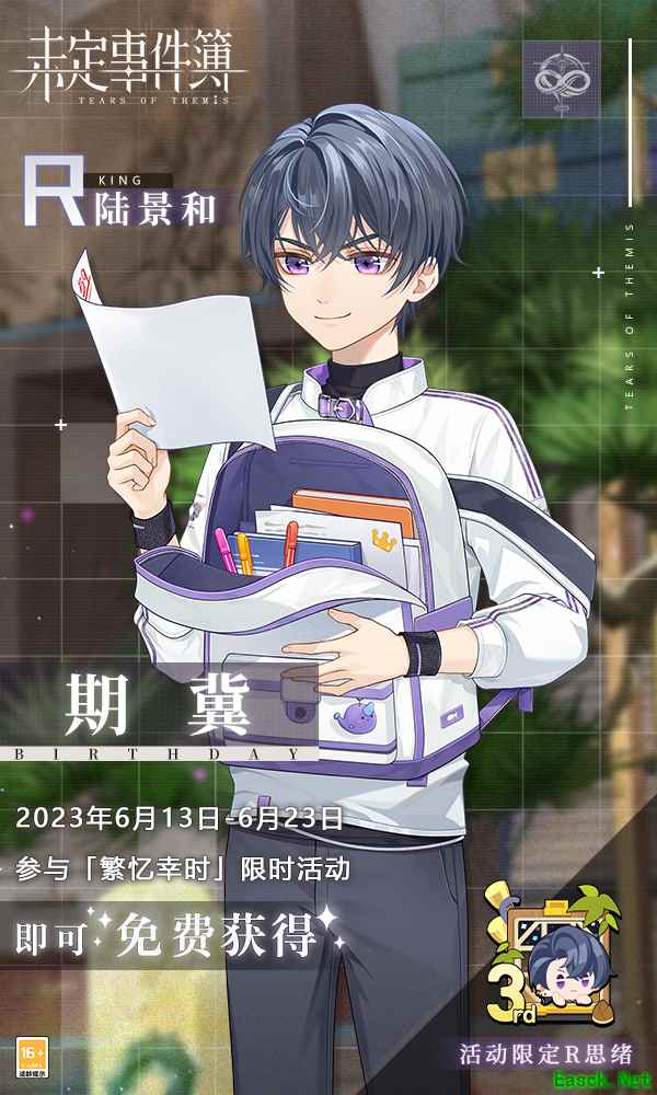 生日限定福利解锁 昔时繁忆萤影浮光 「繁忆幸时」陆景和生日系列活动已近尾声,精彩活动剧情、多重生日奖励今日解锁。6月21日起,「繁忆幸时」限定剧情解锁。完成生日限时任务还可获得陆景和R思绪【期冀】、生日服装【陆景和·繁忆】、生日背景【陆公馆书房】、活动纪念徽章【繁忆幸时】及【女神之泪】等多重限定奖励。此外2023年6月21日00:00至6月27日23:59,登录游戏还可获得生日专属短信【惊喜】、专属语音电话【繁忆幸时】。