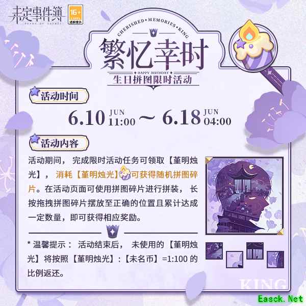 二、「繁忆幸时」生日拼图限时活动开放 6月10日至6月18日,「繁忆幸时」生日拼图限时活动开放。活动期间,完成限时活动任务可领取【堇明烛光】,消耗【堇明烛光】可获得随机拼图碎片。在活动页面可使用拼图碎片进行拼装,长按拖拽拼图碎片摆放至正确的位置且累计达成一定数量,即可获得相应奖励。