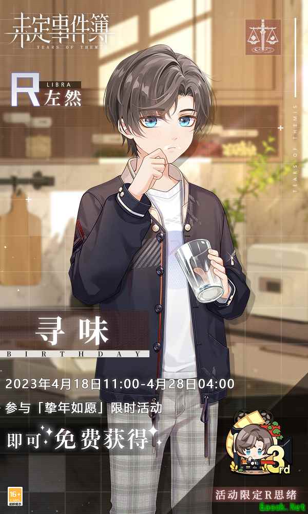生日限定福利解锁 故岁荏苒情深几许 「挚年如愿」左然生日系列活动已近尾声,精彩活动剧情、多重生日奖励今日解锁。4月26日起,「挚年如愿」限定剧情解锁。完成生日限时任务还可获得左然R思绪【寻味】、生日服装【左然·挚年】、生日背景【幼时餐厅】、活动纪念徽章【挚年如愿】及【女神之泪】等多重限定奖励。此外2022年4月26日00:00至5月2日23:59,登录游戏还可获得生日专属短信【安排】、专属语音电话【挚年如愿】。