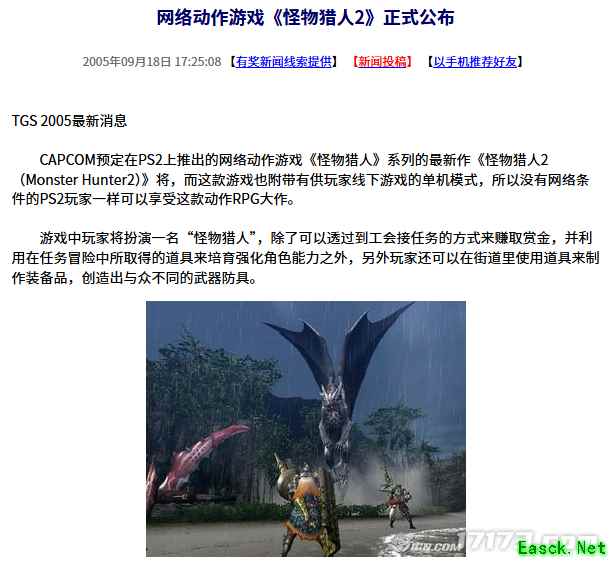 “今天是2025年9月18日,让我们将指针拨回2005年,看看20年前的今天,游戏圈都发生了哪些充满回忆的事情吧。” 以下是原文内容: CAPCOM预定在PS2上推出的网络动作游戏《怪物猎人》系列的最新作《怪物猎人2(Monster Hunter2)》将,而这款游戏也附带有供玩家线下游戏的单机模式,所以没有网络条件的PS2玩家一样可以享受这款动作RPG大作。 游戏中玩家将扮演一名“怪物猎人”,除了可以透过到工会接任务的方式来赚取赏金,并利用在任务冒险中所取得的道具来培育强化角色能力之外,另外玩家还可以在街道里使用道具来制作装备品,创造出与众不同的武器防具。 而本作在任务方面也非常丰富,并不单只是打怪练功而已。玩家在游戏中除了“据点防卫”、“夺取道具”等之外,还可以参与“打倒魔王”等各种任务,透过不同任务的参与组合,创造出丰富多样的全新故事发展。而在“2”中玩家将体验更丰富的场景与任务,使玩家对于游戏的世界又更广阔的体验。。 游戏中的怪物都是拥有会肚子饿、想睡觉等各种生理欲求的生物,因此玩家在游戏中也可以针对这些拟定战略,例如先潜到湖中,等怪物来喝水露出破绽时再趁隙给予致命一击等等,可说是非常有趣。而当玩家被怪物追的时候,也可以利用各种障碍物来拟定逃出生天的作战计划,让玩家体验到其他游戏所没有的全新乐趣。 从以上公布的画面来看,游戏秉承系列的传统,并且增加了许多新场景,使玩家保持了对游戏的新鲜感,不过对于前作物品是否继承,现在还未公布,期待官方的新消息。 小编说: 今年的东京电玩展(TGS)即将于9月25日拉开帷幕。同样的展会,熟悉的《怪物猎人》新作亮相,却已不再是当年的模样。若将时光倒回20年前,任谁也难以想象——如今站在TGS聚光灯下的《怪物猎人》重点作品,竟会是卡普空与腾讯携手打造、登陆移动平台的《怪物猎人:旅人》。 |