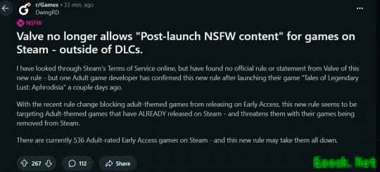 近日游戏博主Pirat_Nation爆料称,有玩家发现Valve官方正式调整了Steam平台规则,不得以补丁形式追加成人内容。 今后所有游戏开发者将不能以免费补丁形式,为游戏追加NSFW内容(即包含裸露、暴力或色情等不适合在工作场合浏览的内容),而DLC除外。 Steam新规发布后,该平台上536款处于抢先体验状态的成人游戏将会受到极大影响。 |