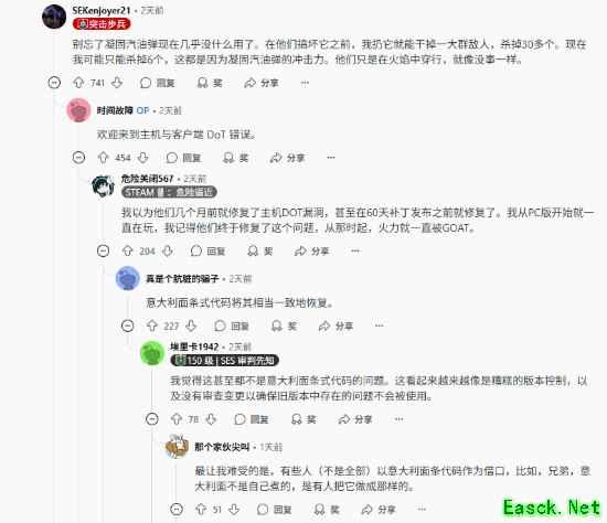 《绝地潜兵2》自去年年初发售后即广受玩家关注,游戏出色的内容设计广受好评。但相较而言,游戏的优化、策划屡屡引发玩家不满。 9月16日,本作开发商箭头工作室发布了更新,宣称修复了“房主和客机难度不同步的问题”。此前,该问题会导致房主更容易被敌人(钻地/耄耋旅)盯上,而客机则可以轻松逃脱。 但令人不满的是箭头的处理方法,他们实际上并没有处理这个问题,而是直接“消灭”了这个问题——他们没有削弱房主的难度,而是增强了敌人的仇恨,现在所有玩家都将承受房主的地狱难度。 愤怒的玩家在相关论坛上疯狂冲锋,帖文有超过上千玩家的点赞和怒吼。有玩家大呼:你们是耳朵聋吗,这么多天了居然就想出这种逆天的解决方案? 此外,有玩家指出,箭头虽然坚持每周进行反馈调查,但整个工作室仿佛是插进沙子里的鸵鸟,对差评投诉视而不见,却精心挑选各种正面评价来回复。 玩家评论: |