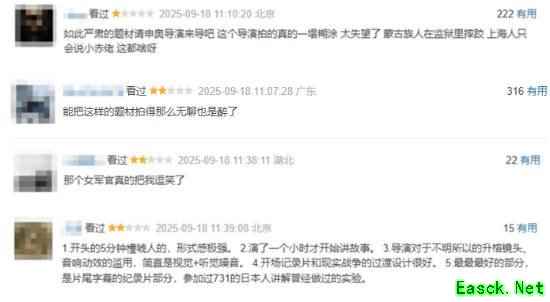 电影《731》于9月18日上映,截至9月17日,《731》的首日预售场次已经超过了23.6万场,成为中国影史上映首日场次冠军。 《731》在豆瓣的早期影评现已出炉,网友们对这部电影的评价呈现两极分化的趋势,给出四星和五星的网友表示,《731》的尺度非常大,用艺术还原了历史真相,必须要永远铭记这段历史,且片尾字幕的纪录片是一大亮点;给出三星、二星与一星的网友认为,《731》的剧情逻辑较差,且拍摄手法不佳,电影里日本女军官的一些镜头让人不适。 据悉,《731》是由赵林山自编自导的战争题材电影,由姜武、王志文、李乃文领衔主演,长影联合出品。电影以1945年哈尔滨平房区为背景,揭露侵华日军第七三一部队以细菌战研究为名,通过活体冻伤实验、毒气实验等手段残害平民的真实历史。影片通过小贩王永章等平民视角展现受难者的反抗,传递反战理念与生命尊严的普世价值。 |