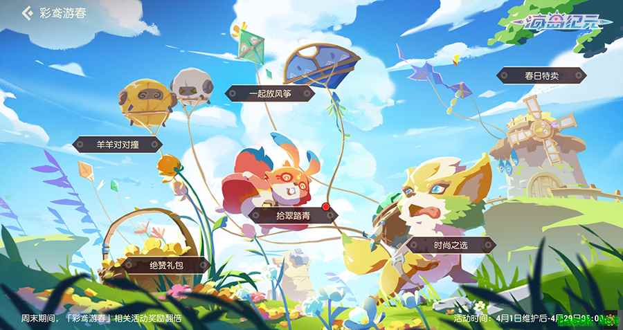 海岛放风筝 打卡应季活动! 海岛四月天,正是放风筝的好季节,海民们可不要错过~在「彩鸢游春」活动期间,参与超多部落活动获得更多积分,「一起放风筝」吧!累计更高积分,海民们就能解锁不同阶段的「春风回礼」,领取风筝带回来的惊喜好礼,更有机会让你的部落登上荣誉排行榜。「羊羊对对撞」经典回归,单人或5人组队匹配,一起争夺灵风城第一羊倌的头衔吧!