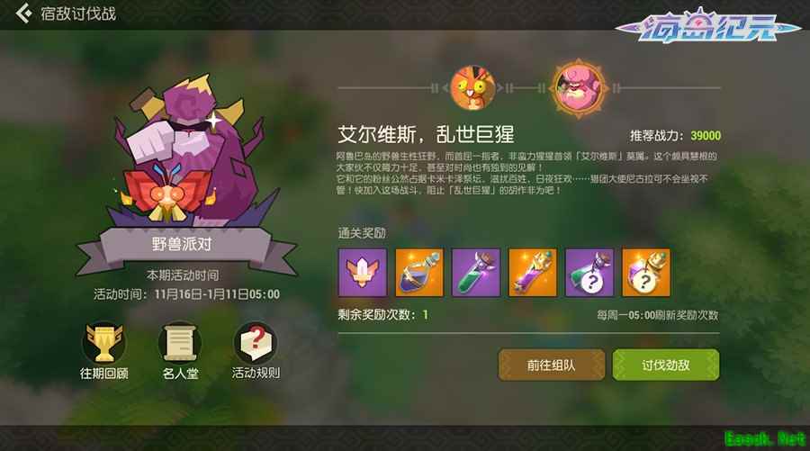 解锁「宿敌讨伐战」全新主题 来「野兽派对」纵情狂欢吧! 半年庆狂欢之际,除了「诡影迷踪」、「海岛奥德赛」、「感恩盛宴」等丰富趣味活动,海民勇士们还可以选择超多硬核玩法。“感恩庆典”期间,超难周常本「宿敌讨伐战」迎来了全新主题「野兽派对」。海民们将告别萨珂弥的疯狂复仇,迎接新首领「蝶粉女王」和「乱世巨猩」发出的挑战,你准备好应战了吗?快快加入或组建5人小队,并集结另一只小队组成10人团队,方可开启挑战。