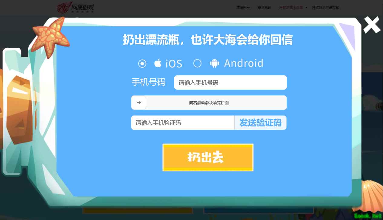 在清新的沙滩上,一个穿着树叶围裙的不明生物,背对屏幕面朝大海,似乎在咸咸的海风中眺望海天一色,海面上漂浮着两个圆形的玻璃漂流瓶。不明生物、大海、漂流瓶,应该就是这款未曝光游戏的关键信息,从这张图还有网易游戏域名的规律可以也可以推断,倒计时页面域名中的hd,很有可能是海岛的缩写。 通过倒计时页面透露的信息还可以看出,这款新游是轻松的卡通逗趣画风的。除了倒计时外,玩家还可以点击页面中的两个按钮,选择向大海扔瓶子或者是试试看捡一个瓶子。 如果选择扔瓶子,页面会弹出一个收集信息的窗口,可以选择手机系统,进行游戏的预约获取测试资格。而如果选择捡瓶子的话,玩家会随机捡到写有文字内容的漂流瓶,比如” 我们各自所拥有的小岛,会聚集成一个岛群,但是搞不好会互相打起来”,这些应该内容应该是关于游戏玩法的。