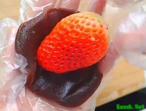 第二步:制“馅” 草莓洗净、擦干水分,用豆沙馅包裹住草莓,放冰箱冷藏30分钟至豆沙变硬,大福馅完成!