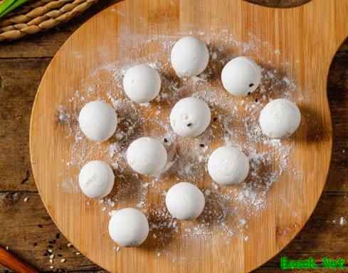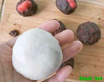 第三步:包“汤圆” 取一块凉透的糯米团胚,压扁,摆入大福馅,然后慢慢收口,包好,搓圆~