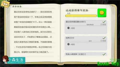 点击屏幕上的日记按钮,可以随时查看日记,只有达成解锁条件,相应的日记章节才会解锁。在小森的日子越长,这本日记也会变得越来越厚重:记录新鲜出炉的料理、记录房子被打扫的焕然一新、记录砍伐与种植的经验心得…… (渐渐地,我也养成了写日记的好习惯~)