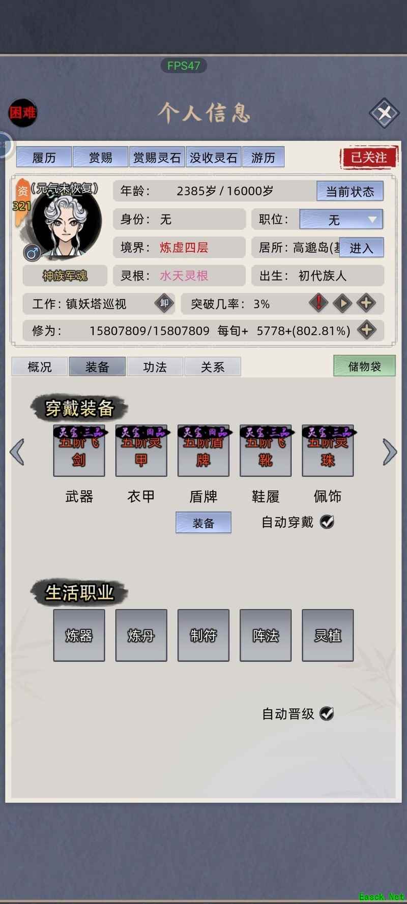 到化神期后先打造一座巨岛,再逐步建立微、小、中、大型岛屿各一座,稳守发展。安排弟子前往各岛挖矿资源,同时培养一名五级炼器师(虽未真正达到五级,但为了加快进度就先将就使用)。老祖则前往无人大型岛屿刷取精血提升实力,之后便可继续外出游历。功法方面,将自创功法全部换成提升驯养和装备获取的类型,暂时舍弃战斗类功法,等装备成型后再重新修炼回来。