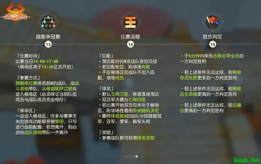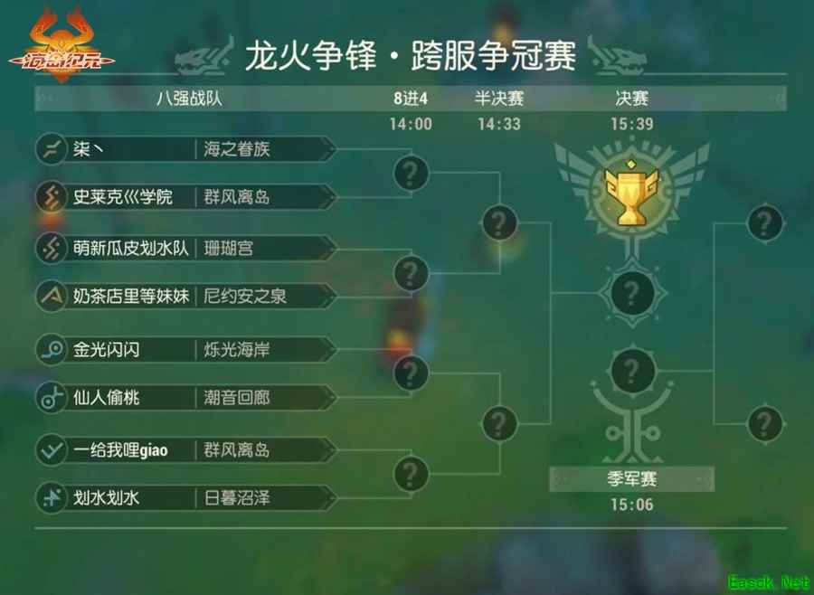 跨服决赛周日激燃打响 跨服决赛,周日开战!经过了多轮激烈对抗,龙火争锋跨服PVP精英赛将于本周日14:00-17:00(2020年7月19日)迎来跨服决赛,把本次赛事推向最高潮!在最终的「跨服争冠赛」中,上面公布的每个赛区8支最强的战队将各自交战,以五局三胜制来决出胜负,败者直接淘汰,留到最后的两支队伍以七局四胜制决定冠、亚军归属。龙火争锋跨服PVP精英赛最终排名前4的战队,将分别获得跨服冠军、亚军、季军、殿军头衔。