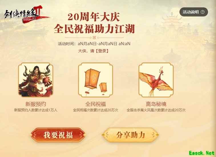 【四海同歌 全民挑战】 四海同歌活动为《剑网2》20周年全民挑战活动,分为三个挑战活动:新服预约、全民祝福、全服挑战。当三项挑战全部达成,全区全服符合领奖条件的大侠均可领取一份20周年纪念豪华大礼-凤凰羽跟宠、少年游挂件!