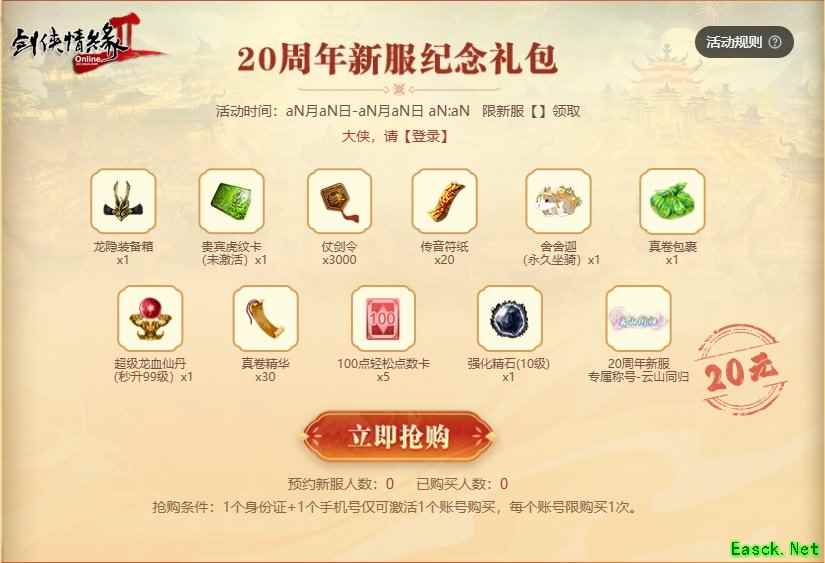 【礼包购买细则】 在礼包购买期间,大侠需要先在20周年庆活动专题页面激活账号,同1个身份证 + 1个手机号仅可激活1个账号购买,新服礼包限购1次,仅限在新服【云山同归】领取使用,且仅限账号下1个角色领取对应的礼包,道具均为绑定。