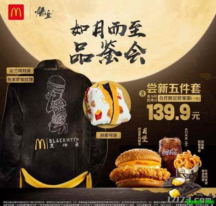 今日,麦当劳中国正式宣布与国产3A大作《黑神话:悟空》展开跨界联动,推出“天命人”主题中秋限定合作系列。此次联名以“秋风初起,天命重燃”为主题,融合游戏中的东方神话美学与麦当劳的经典品牌形象宴。 联动套餐开启预约,限量三万份售完即止 自今日(9月19日)下午14:00起,麦当劳APP、微信小程序及支付宝小程序已正式开放联动品鉴会预约通道。本次推出的“尝鲜五件套”套餐售价139.9元,包含限定汉堡、薯条、风味派与可乐等美食,全国限量仅30,000份,先到先得,售完即止。 更令粉丝心动的是,购买该套餐的消费者将获赠一件《黑神话:悟空》x 麦当劳联名限定双面可穿法兰绒家居服。家居服采用高品质法兰绒材质,印有专属定制纹饰,设计灵感源自游戏中“天命人”的战袍元素,兼具实用性与收藏价值,被网友戏称为“黑神话战袍”。 此外,《黑神话》官方品牌“黑神话BLACKMYTH”也于9月16日宣布,2025秋季衍生品将于9月20日12时正式开售,涵盖小八戒雕像、天命人厌火套装等新品,暗示更多“隐藏惊喜”正在筹备中。 |