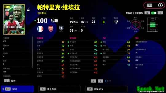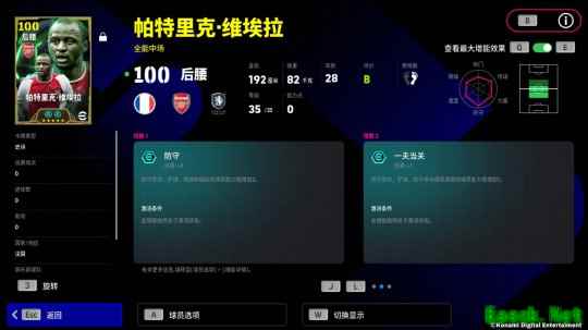 *增能后球员总评可达100分,上阵最大总评可达105分 【防守 +2】的增能属性,让维埃拉的防守更上一层楼,用凶悍的铲断化解对手的进攻!维埃拉还自带特殊技能【无定型传球】,即使面对重重包围,他都能够用一脚妙传为队友输送炮弹!