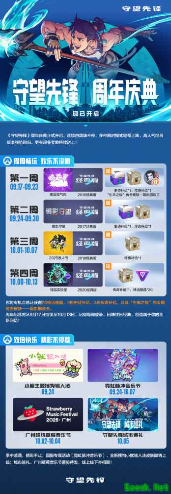 周年纪念,狂欢来袭 9月17日至10月13日,《守望先锋》将开启连续四周的特色庆生日程,周周活动不重样。不仅能畅玩魔法淘气包、镜影守望、2025愚人节、怪鼠实验室等多种限时模式,还可重温各种经典版本。别忘了周年纪念奖励多多,参与活动即有机会总计获得20神话棱晶、3份史诗补给、3份传奇补给,以及“生命之梭”的专属传奇皮肤——吸血摄政王。 除了周年纪念的各类丰富玩法,国服专属活动【霓虹脉冲音乐节】、全新搜狗小鱿输入法皮肤也即将上线;城市巡礼、广州超级草莓音乐节蓄势待发,线上线下精彩不停!
