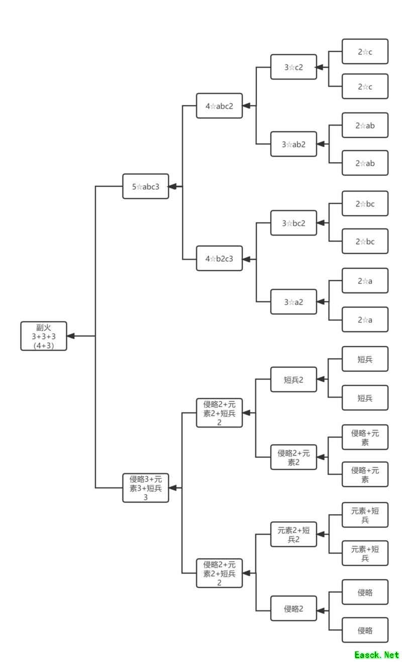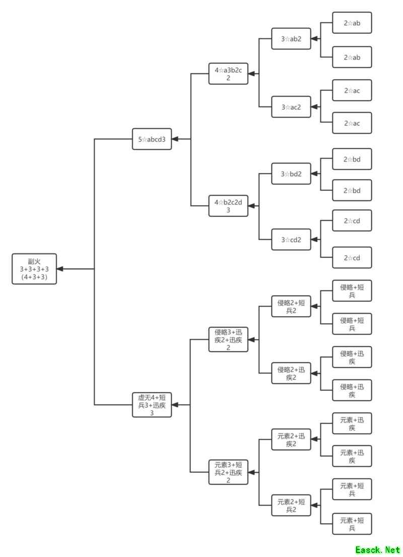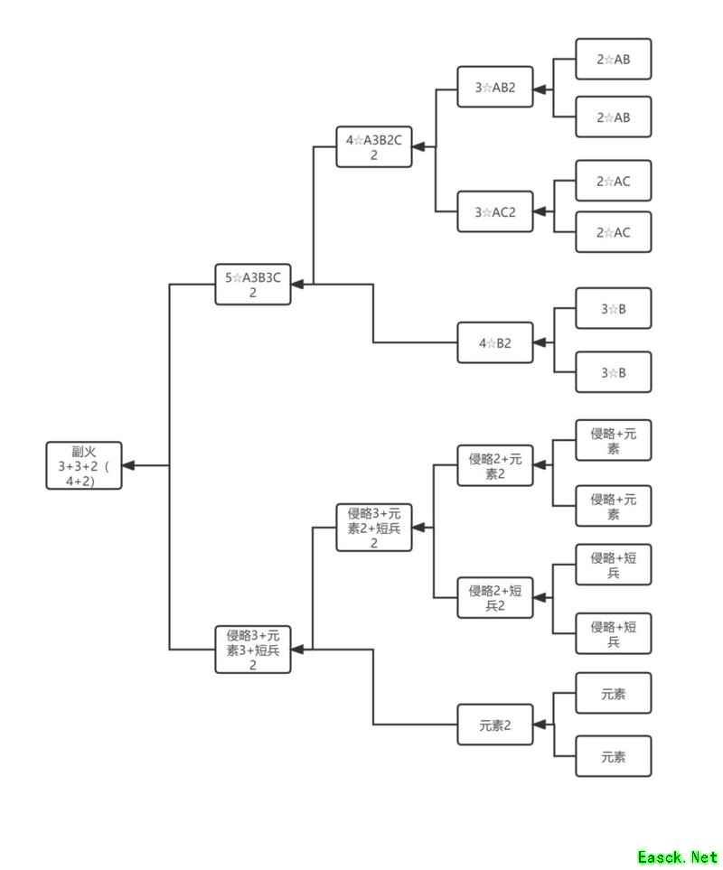 自带特性的3星红火称为B,当两个B融合后可得到4星的B2。由于副火A3B2C2已达4星,因此可进行融合,且副火星级需不低于主火。 ----------------分割线----------------- 副火3+3+3+3公式: 可用于三合一设备,也可用于二合一设备。 三合一的话,也相当于4加3。 如果是二合一的话,那也相当于4加3加3。 AB AC BD CD 各两组. =(AB2+AC2)+(BD2+CD2) =A3B2C2+B2C2D3 =ABCD3 附图