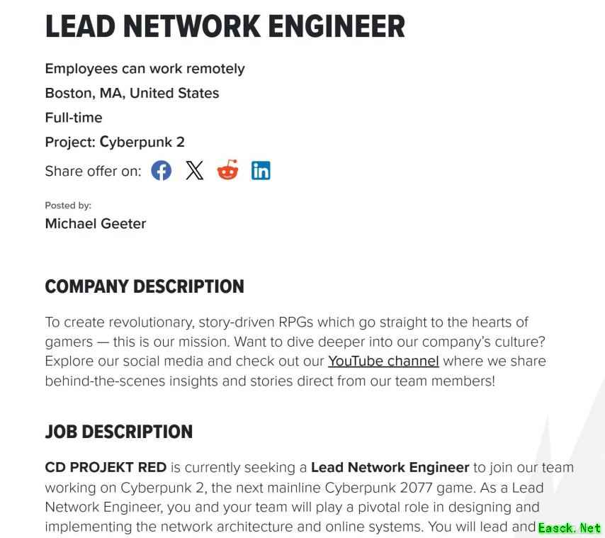 CDPR秘密开发《赛博朋克2》多人模式?首席网络工程师招聘引发热议