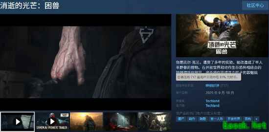 《消光:困兽》Steam好评率为81%,显示为特别好评。玩家将扮演凯尔·克兰,遭受了多年的实验,被改造成了半人半野兽的怪物。在开放世界和动作生存恐怖相结合的独特游戏体验里,追杀把你变成这个样子的罪魁祸首。