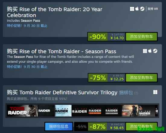 季票也以2.5折的力度促销中,优惠价12.25元。不过一定要注意,20周年纪念版自带DLC季票,所以新玩家无需购买。 同时,新版《古墓丽影》三部曲也以新史低的优惠打包促销中,仅需58.75元就能一次性玩到三款高清劳拉的完整版本(包含全DLC)。
