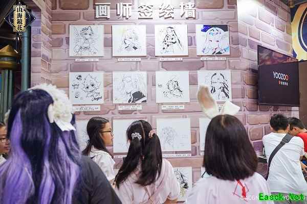 《山海镜花》BW&麽多现场人气火爆 《山海镜花》展台设计与游戏美术风格一脉相承,不仅将大荒世界的魅力传递给了现场玩家,更有不少有趣的设计细节。发光的车站标识从远处即清晰可见,不同角度下展现不同角色的光栅画,以及点缀于展台各个角落的精美立绘,让展区内外满载惊喜。鬼面童子也带着大荒美食坐镇展台,成为现场颇具吸引力的合照点。占据展台一隅的画师签绘墙,现场展示了参与镜灵创作的画师们的签名手稿,凝聚了画师们别样作画风格的精美签绘,足以引来现场不少惊叹。