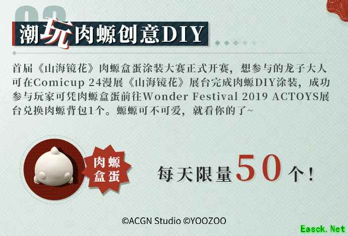 《山海镜花》肉螈盒蛋剪影 现场涂装大赛 自制肉螈盒蛋带回家 想要见到肉螈盒蛋实物,机会就在眼前!肉螈盒蛋将会首次亮相游族《山海镜花》Comicup 24展台,不过这次亮相的盒蛋实物并非“完全体”,需要大家亲自动手涂装。前往《山海镜花》展台即可参与肉螈盒蛋涂装大赛,DIY自己的专属肉螈,限量50个的肉螈盒蛋等待着你的定制涂装。成功完成涂装的玩家可以前往WF2019的ACTOYS展台获得肉螈背包哦,这么好的机会切勿错过!