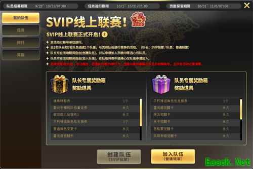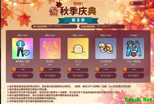 队员招募期限 9/23~10/31/07:00任务进行期限 10/1~10/31/07:00页面保留期限 10/31~11/6/07:00 ★本活动以账号单位进行。★由 1 名队长和 9 名队员组成 1 个队伍,与其他队伍进行竞争的活动。(队长:SVIP 玩家 / 队员:普通玩家)★队长可在活动期间自由 [创建队伍],并从申请加入列表中筛选心仪队员。★队员可在活动期间自由 [加入队伍],在队伍列表中选择心仪队伍申请加入。★若发现使用 [非法程序、恶意刷分等] 行为,违规玩家将被踢出队伍并封禁账号,且所有活动记录清零。本次线上赛的奖励十分丰富,玩家们可以从队长专属奖励箱积极队员专属奖励箱开出心仪的道具。 砰砰 秋季庆典第8季