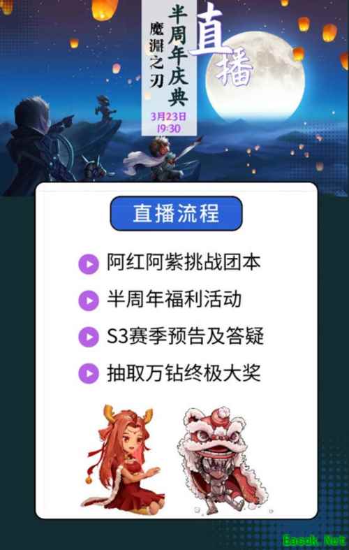 【超多环节精彩不停】 时间飞逝,转眼间《魔渊之刃》公测半周年啦!今晚(3月23日)19:30,一场别开生面的直播将在B站魔渊之刃手游直播间限时放送! 阿红和阿紫现场匹配有缘玩家,挑战最难团本【幽灵挽歌·挑战】,有缘人可直接获得500钻缘分礼物哦! 你真的了解魔渊么?你问我答,你画我猜,趣味答题解锁钻石奖励! S3赛季3月31日即将上线,超多爆料和答疑内容让你提前了解新赛季!