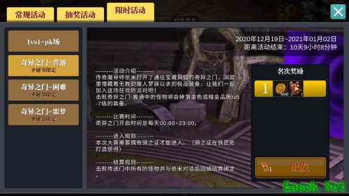【闯奇异之门,得圣诞摇铃】 营地的圣诞节的气息也感染了传奇法师依米,他为大家重新准备了奇异之门的奖品。挑战奇异之门,除了可以在副本中获得不同等级的金色或暗金装备,通关后还可以获得金币和相应数量的圣诞摇铃。