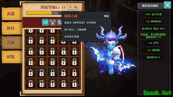 【魔渊装备百科全书】 全新的图鉴系统位于游戏主界面的左上方,点击进入后,你会发现这里基本囊括了魔渊世界里的所有武器、防具、首饰和时装。点击已获得的装备或时装图鉴,可以解锁对应图鉴,并在右侧人物身上展示穿上对应装备或时装的样子。 在装备图鉴版块,记录着每件装备的介绍、技能效果和获取方式。