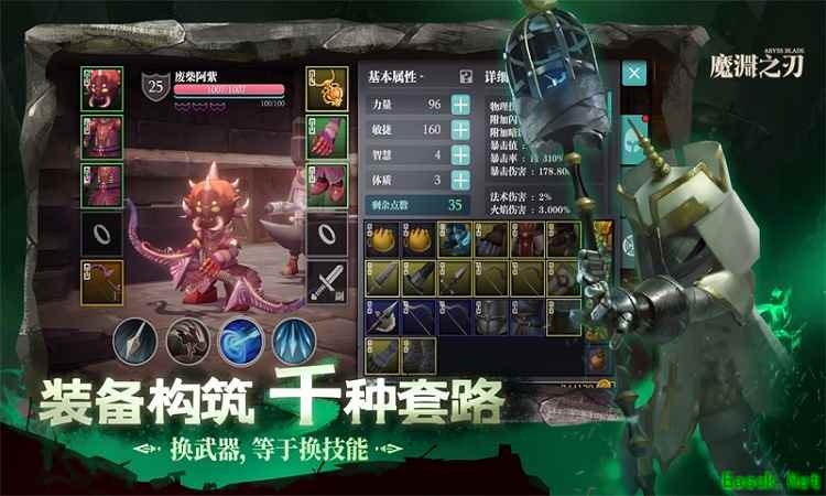 装备BD技能自组的暗黑玩法 这里没有职业限制,进入危机重重的魔渊,你将会获得各种强力武器,每种武器都有不同的技能,还有不少带有特殊能力的装备。我们在收集这些武器与装备的过程中,找到适合自己的搭配,设计自己的作战套路,将会迸发更强大的力量。